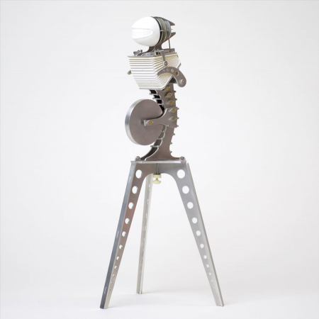 はずみ車のエネルギーで呼吸と、笑うための人口声帯の制御を行うことで、人間のように笑う機械「ワッハゴーゴー」の1/6ミニチュアモデル。 本物と同様、アルミの切り出しパーツを「シノ金仕上げ」し、できるだけ実際の組立方法とおなじネジ止めを行いました。ボディ内部にある歯車や、軸を止める側面のベアリングなど細かい部品も忠実に再現。背中から見たメカニズムの美しさも鑑賞できます。
